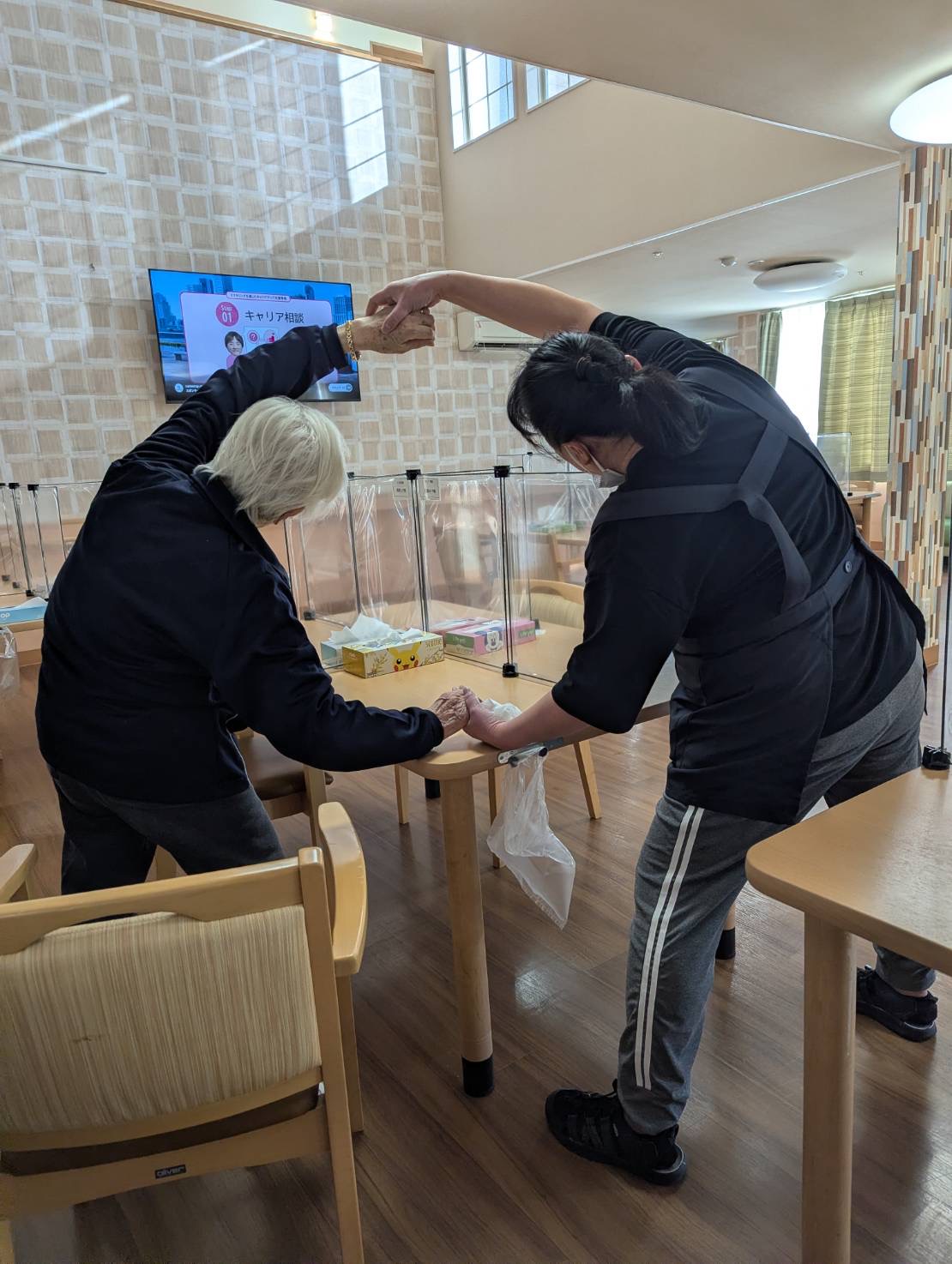 施設内では、日向ぼっこをしたり、室内で軽い運動やレクリエーションを行いながら、皆様元気に過ごされています。